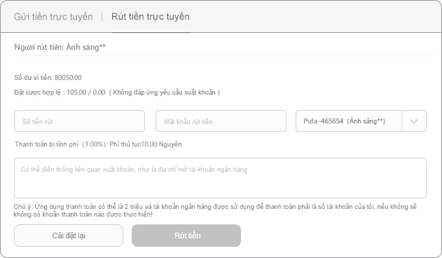 02Điền số tiền cần rút, nhập mật khẩu rút tiền, chọn tài khoản ngân hàng để chuyển, điền ghi chú, nhấp vào "Rút tiền".